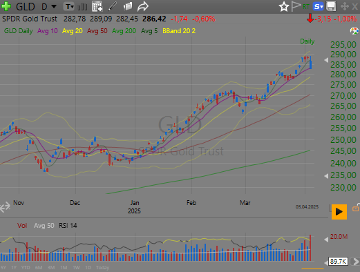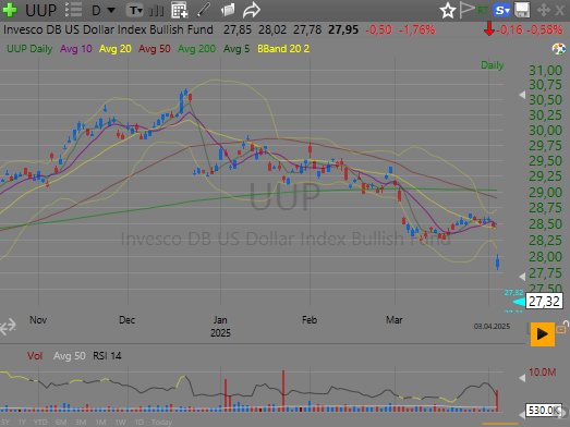Now let’s take a look at the dollar index and gold. This -4% move in UUP on December 23, 2024, is just an ex-dividend event, which happens once a year in late December. Imagine there is no gap there — look at how the dollar was not able to make a new high in February and was selling off, indicating that big funds thought the tariff wars might bring weakness to the U.S. economy.
