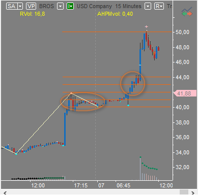 We see the stock gapped up, found resistance at $42, and found support around $40 in after-hours. The next day, it never traded below $40 and then started holding above $42 in pre-market—this is very bullish price action. It’s a strong sign when a stock trades above the after-hours high the next day; this is very good for long breakouts. The opposite is also true for shorts. In this example, the stock went right to the $50 level on huge relative volume.