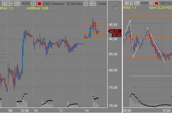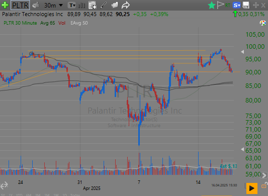 We can add the $92 level—it spiked to this level twice in prior days, and today in pre-market, it found some resistance there. The stock didn’t make much volume in pre-market, and its relative volume was not very high (partly due to the huge volume the stock typically trades on, partly due to the market being very active because of Trump tariffs and partly due to the news not being that breaking). So, PLTR opened at a high of around $95, found support at $95, and tried to move up, but failed at $97.3 and slipped to $92. It then went up to $96 and slipped again to $92.