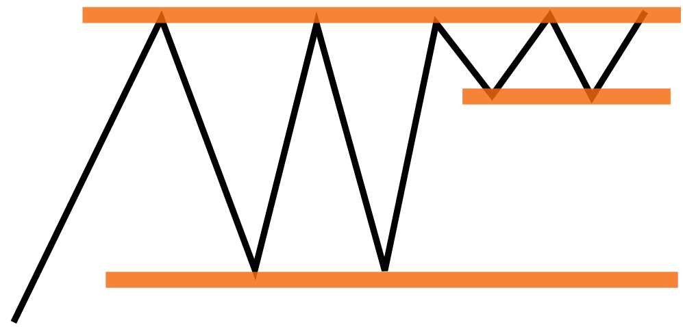 Tight Range Near Extreme of Larger Range. Another pattern, closely related to the previous one, occurs when the market forms a tight range near the edge of a larger, established trading range. This tight range is typically less than 25% of the height of the larger range and indicates that large traders have become actively engaged, keeping the price pinned near the boundary of the broader range. Why are these traders now willing to buy at higher prices (or short at lower prices) instead of allowing the market to drift naturally back toward the center of the range? This behavior suggests increased urgency and stronger conviction in their actions. Such patterns often precede significant breakout trades, as the market aligns with their intentions.